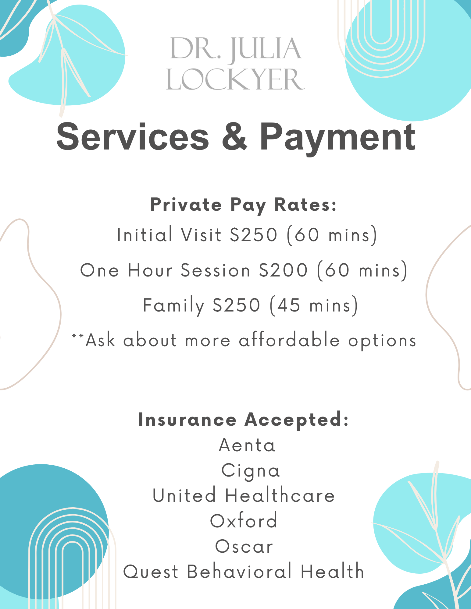 **Dr. Lockyer accepts Aetna, United Healthcare, Oxford, Oscar, Quest Behavioral Health and Cigna for Insurance coverage.